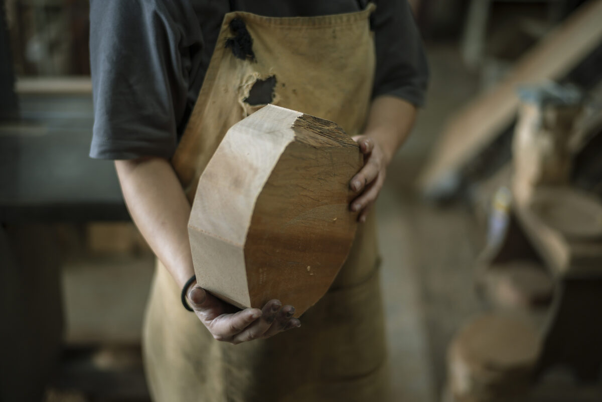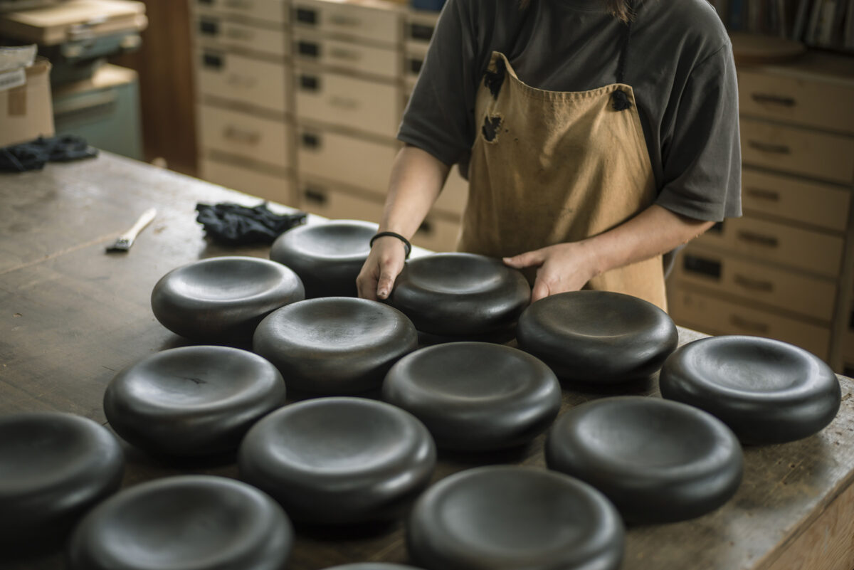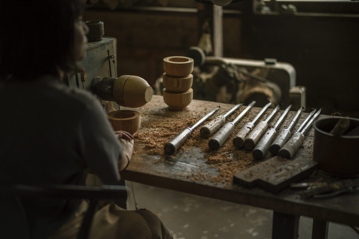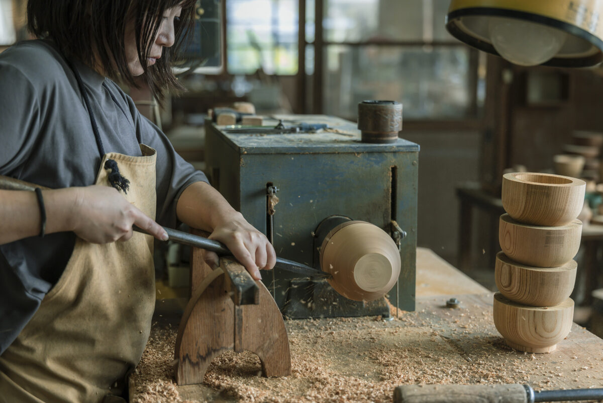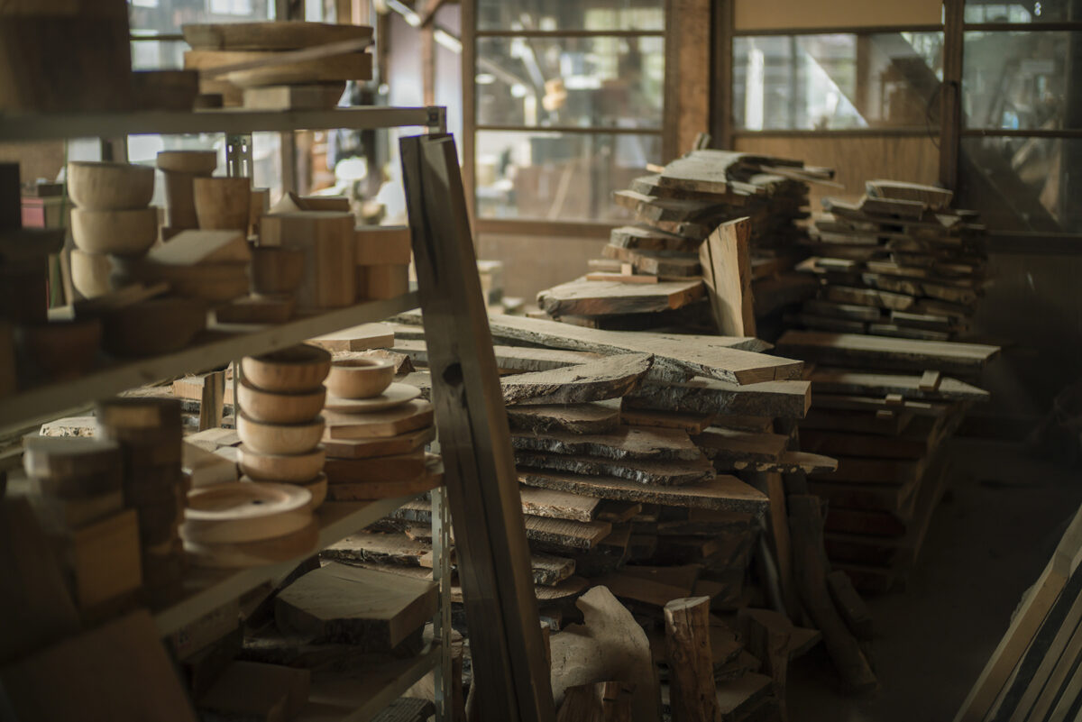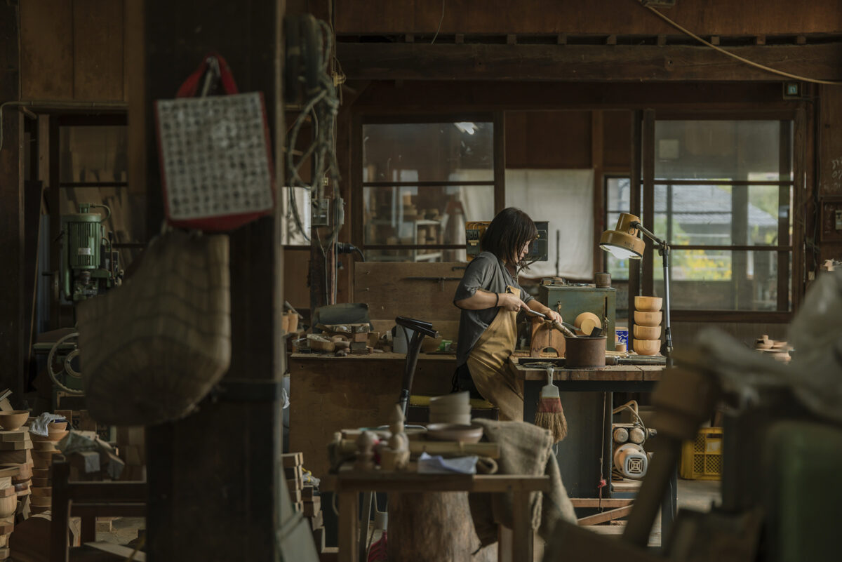 挽物木地師であり山中漆器伝統工芸士、また個人で木工作家として活躍される、小松市内で工房を構える生地史子さん。20年という経験を持ち、木を知り尽くしているからこそ表現できる木の持ち味を生かした独自の風合いが魅力で、数年前ある展示イベントで出会って以来、今回のオープンに合わせてようやく製作を依頼することができました。木材選びから、木を挽き、轆轤で成形、漆を塗る工程まで全てお一人でやられています。木が持つストーリーをも作品に込め、山中漆器の魅力を最大限に表現してくれます。ゼロからスケッチして製作いただいた、ヤマザクラの器や朝食用の椀など、お人柄が出る優しい風合いに仕上がっています。
