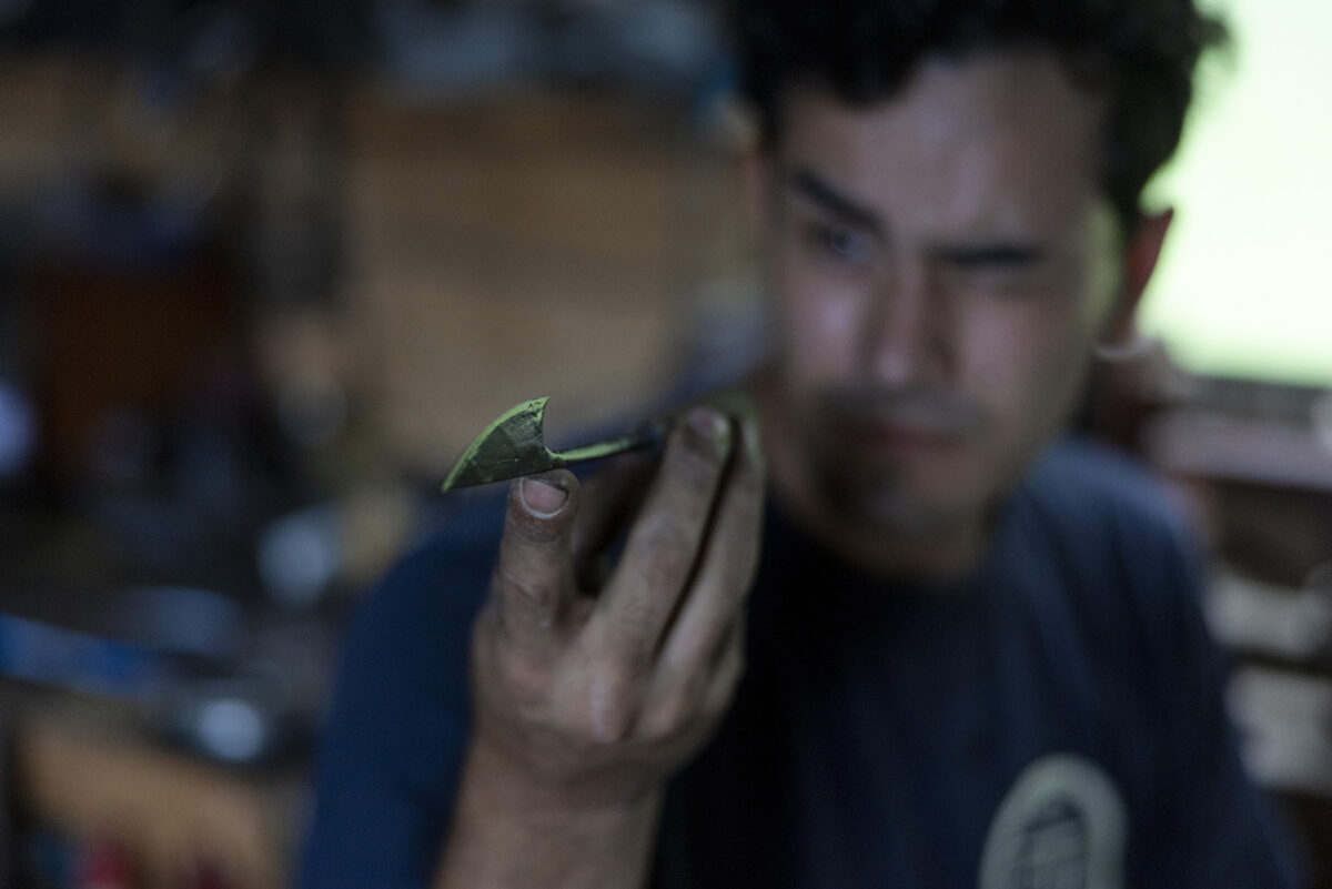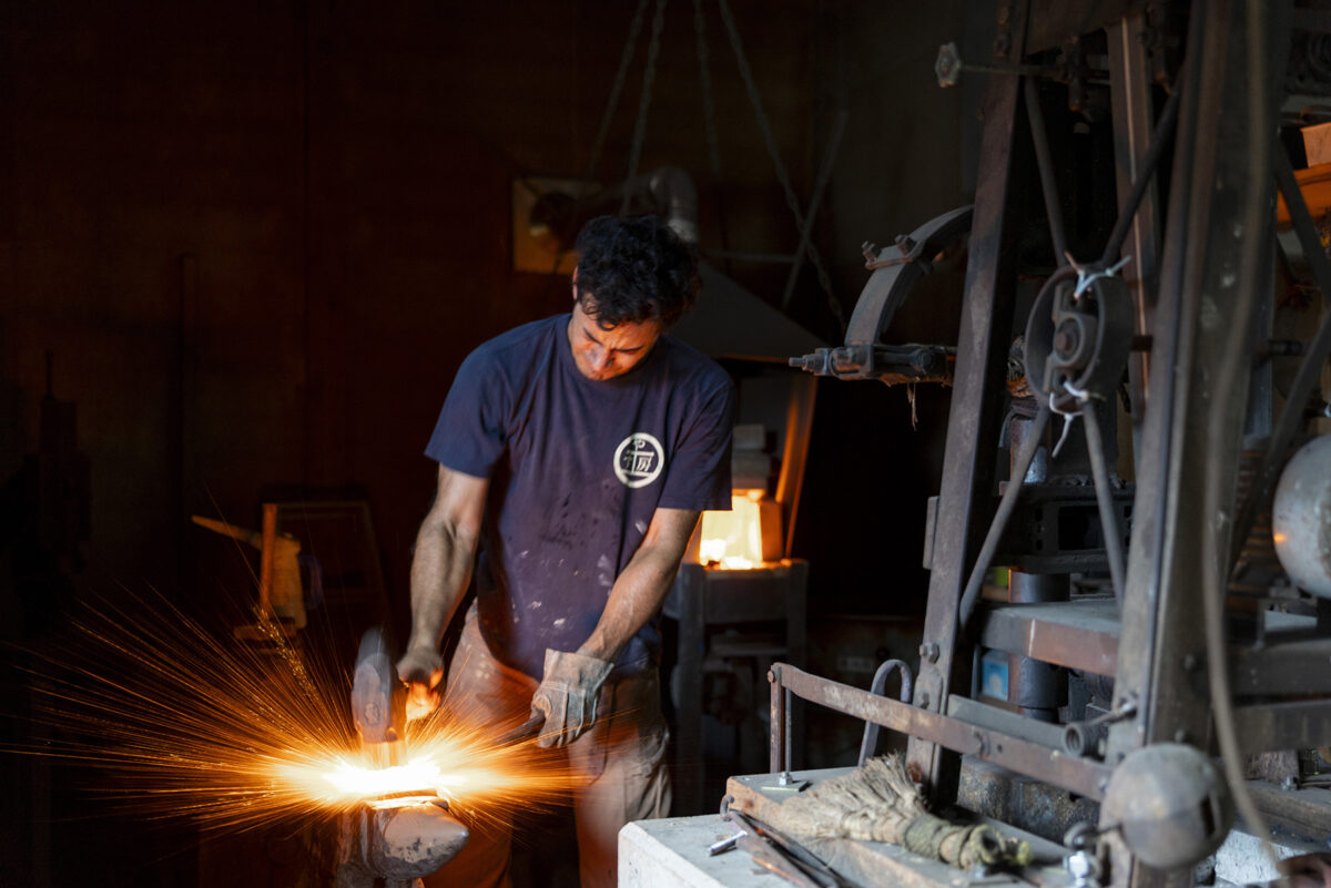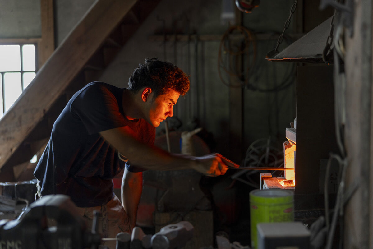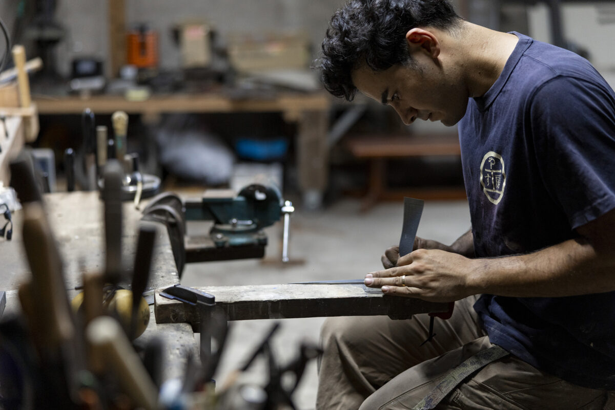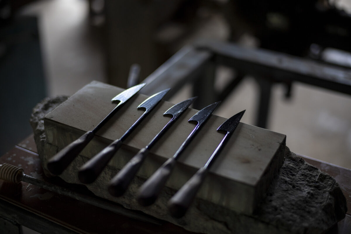 奥金沢・湯涌の田園風景が広がる集落の中で、一人鍛冶師として情熱を注ぐ若い職人がいた。ブラジル生まれ日本育ちの八杉ヴィニシウスさん。農具や道具をメインに、鉄を熱し、叩いたり研いだりと全ての工程を手打ちで、自身で行うという徹底ぶり。今回エンヌのために、初めてレストラン用のステーキナイフとしてゼロからデザイン、製作をお願いしました。それは「奏(かなで)」と名付けてくださり、タクトのように軽く握り、落とすだけで切れるナイフ。料理全体をオーケストラと見立て、お客様自身が口へ運ぶまでのハーモニーを奏でましょうといった想いが込められています。物語をつなぐ唯一無二のナイフが仕上がりました。